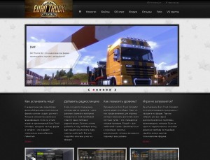 На главной странице размещен уникальный слайдер, а также краткие сведения об игре euro truck simulator 2.